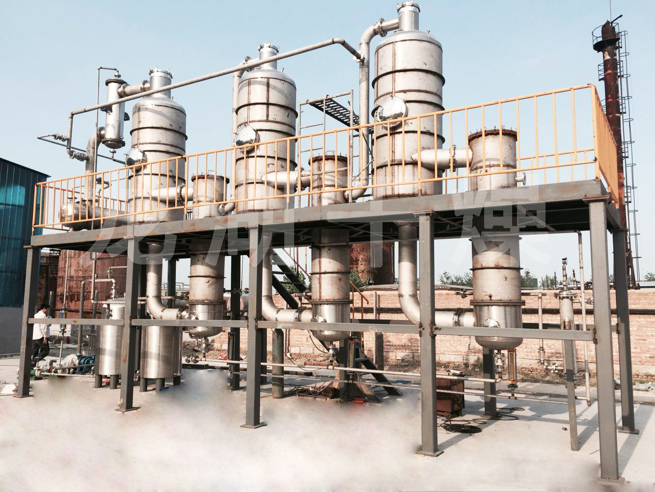 張家港某公司金屬清洗廢水使用現(xiàn)場(chǎng),蒸發(fā)量每小時(shí)200kg,雙效蒸發(fā)器,配備電加熱蒸汽發(fā)生器